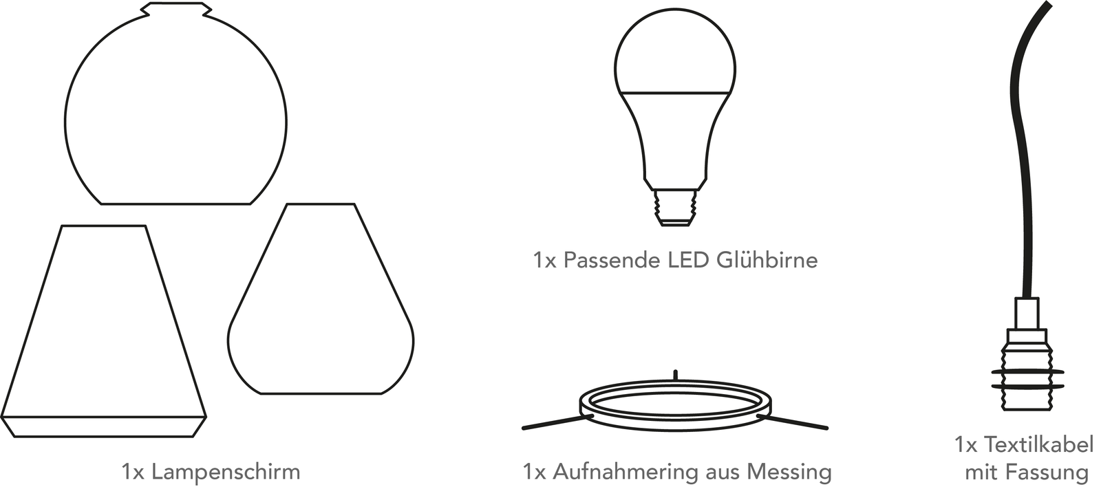 Lampenschirm, Passende LED, Aufnahmering aus Messing, Messingfassung E27 mit vor konfektioniertem Stoffkabel, 2m, elfenbeinfarben.
