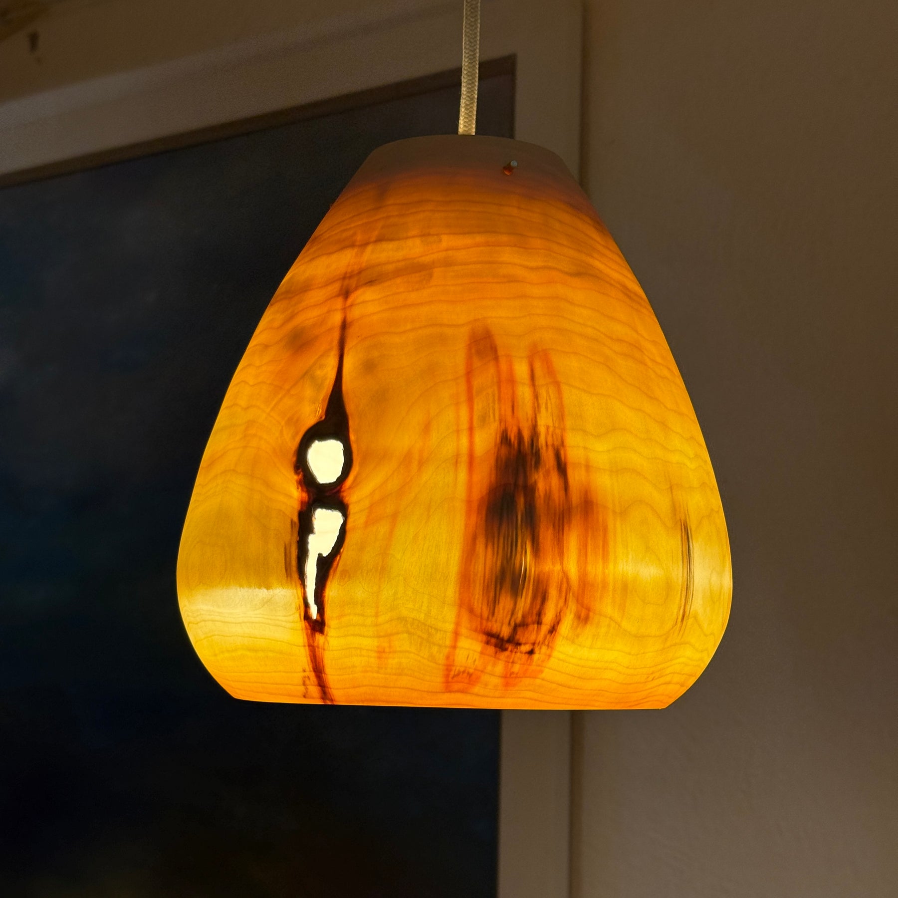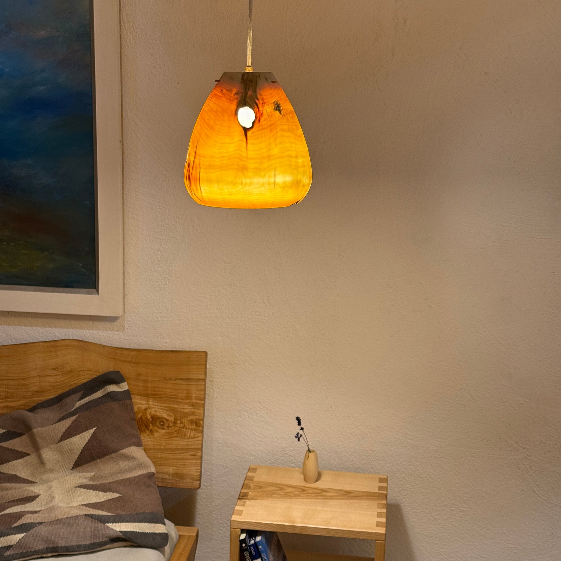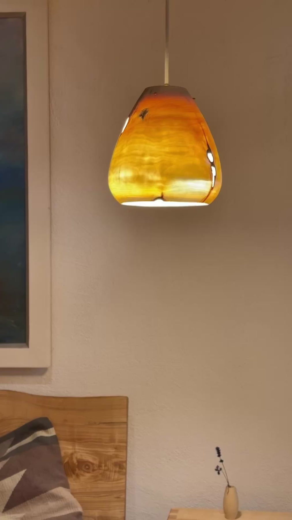 Das Holz dieser Lampen ist wunderschön durchscheinend, hauchdünn gedrechselt. Sie gibt, wie alle unsere Lampen, ein sehr warmes, angenehmes Licht in den Raum ab. Sie passt gut über einen Ess- oder Wohnzimmertisch, oder auch über einen Nachttisch neben dem Bett. Durch ihre Form kann sie relativ hoch aufgehängt werden, ohne dass man geblendet wird.