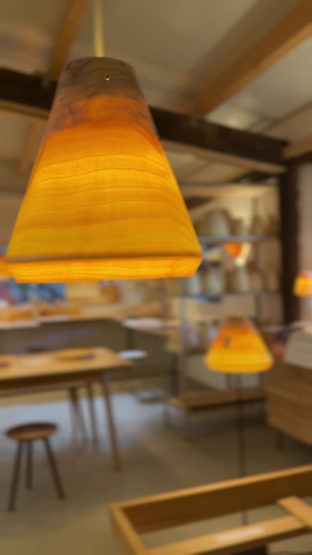 Das Holz dieser Lampe ist wunderschön durchscheinend, hauchdünn gedrechselt. Sie gibt, wie alle unsere Lampen, ein sehr warmes, angenehmes Licht in den Raum ab. Die Form ist sehr schlicht und einfach gehalten, so dass das Holz und seine Maserung sprechen können. Sie passst gut über einen Ess- oder Wohnzimmertisch.
