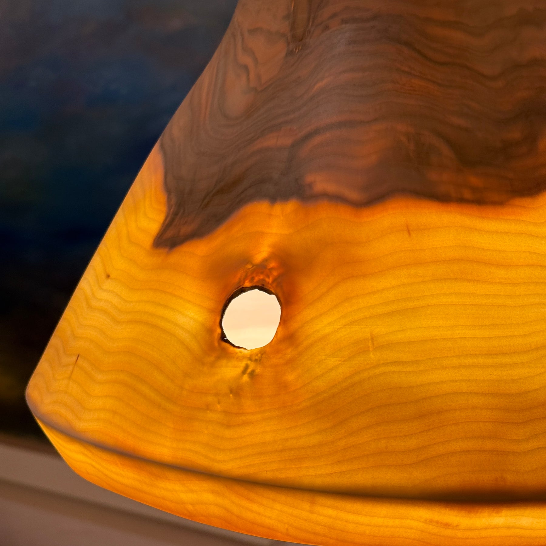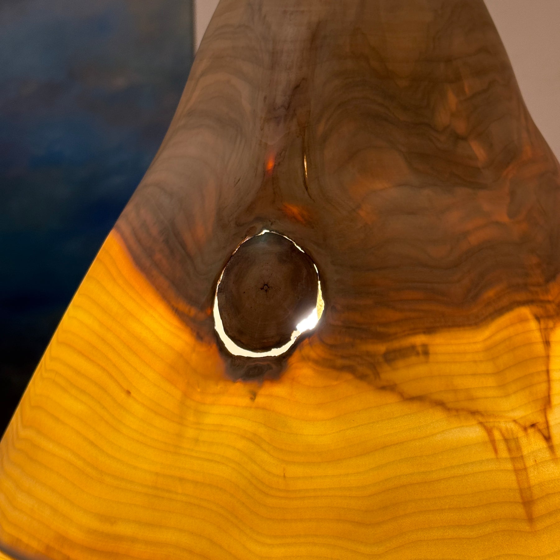 Dieser Lampenschirm hat sich während des natürlichen Trocknungsprozesses bewusst verformt. Spannungen im Holz durften wirken und wurden nicht korrigiert – so entsteht eine organische Form, die den Charakter des Materials sichtbar macht. Inspiriert von der freien Holzkunst verstehen wir diese Veränderung nicht als Makel, sondern als Qualitätsmerkmal: Jeder Schirm ist ein echtes Unikat, geprägt vom Holz selbst und seinem Weg. Das Licht folgt der Form – lebendig, warm und ehrlich.