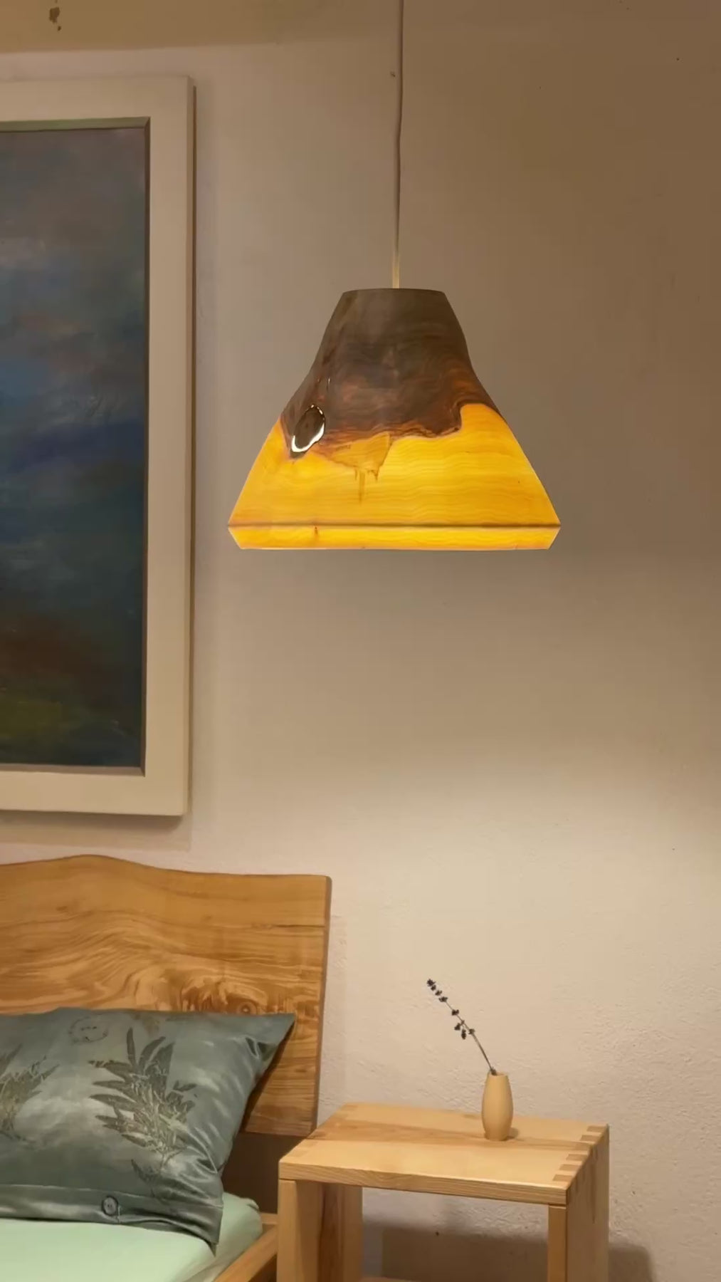 Das Holz dieser Lampe ist wunderschön durchscheinend und hauchdünn gedrechselt. Wie alle unsere Lampen gibt sie ein sehr warmes, angenehmes Licht in den Raum ab. Sie passt gut über einen Ess- oder Wohnzimmertisch oder aber auch in eine kleine Sofaecke.