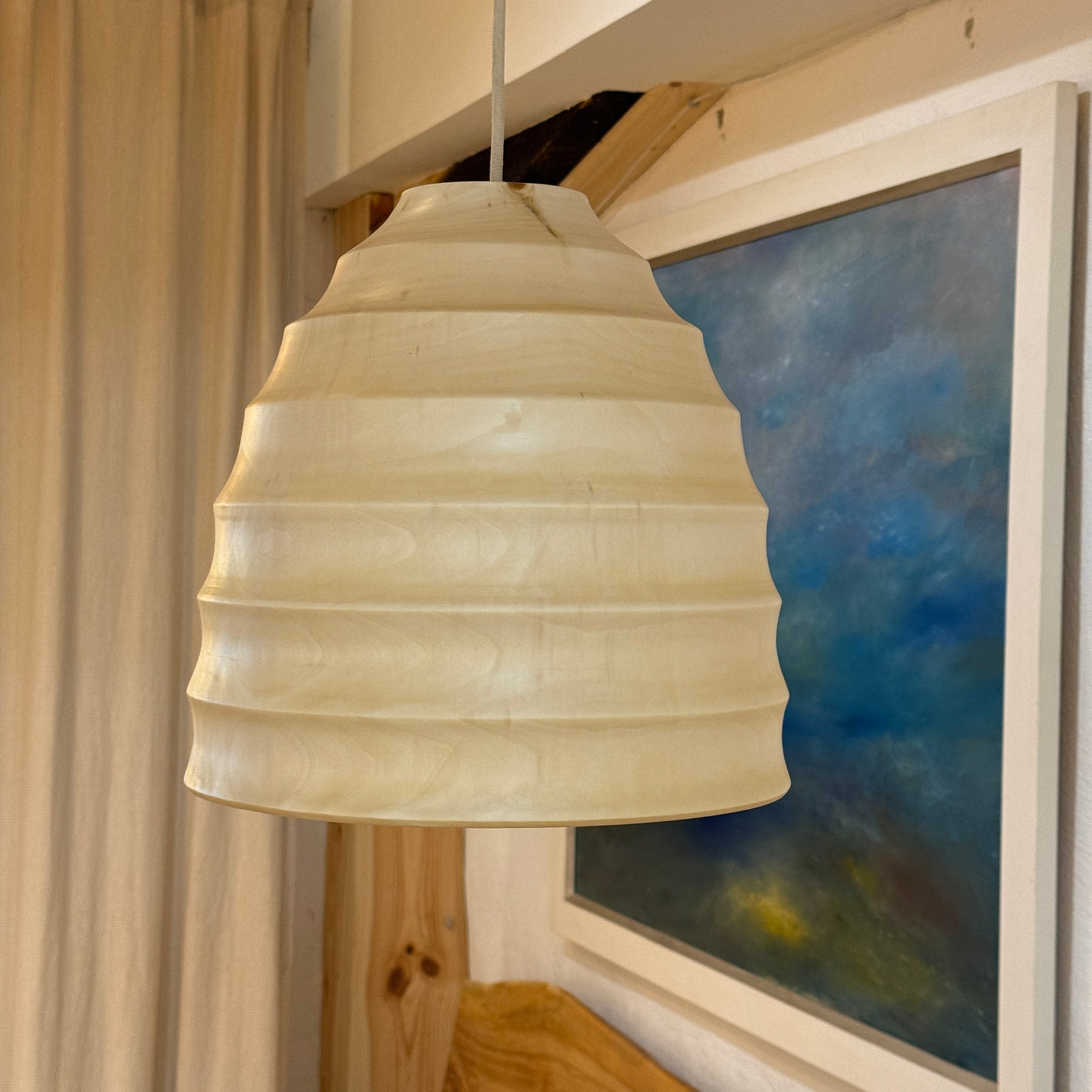 Das Holz dieser Lampe ist wunderschön durchscheinend, hauchdünn gedrechselt. Sie gibt, wie alle unsere Lampen, ein sehr warmes, angenehmes Licht in den Raum ab. Sie passt gut über einen Ess- oder Wohnzimmertisch.