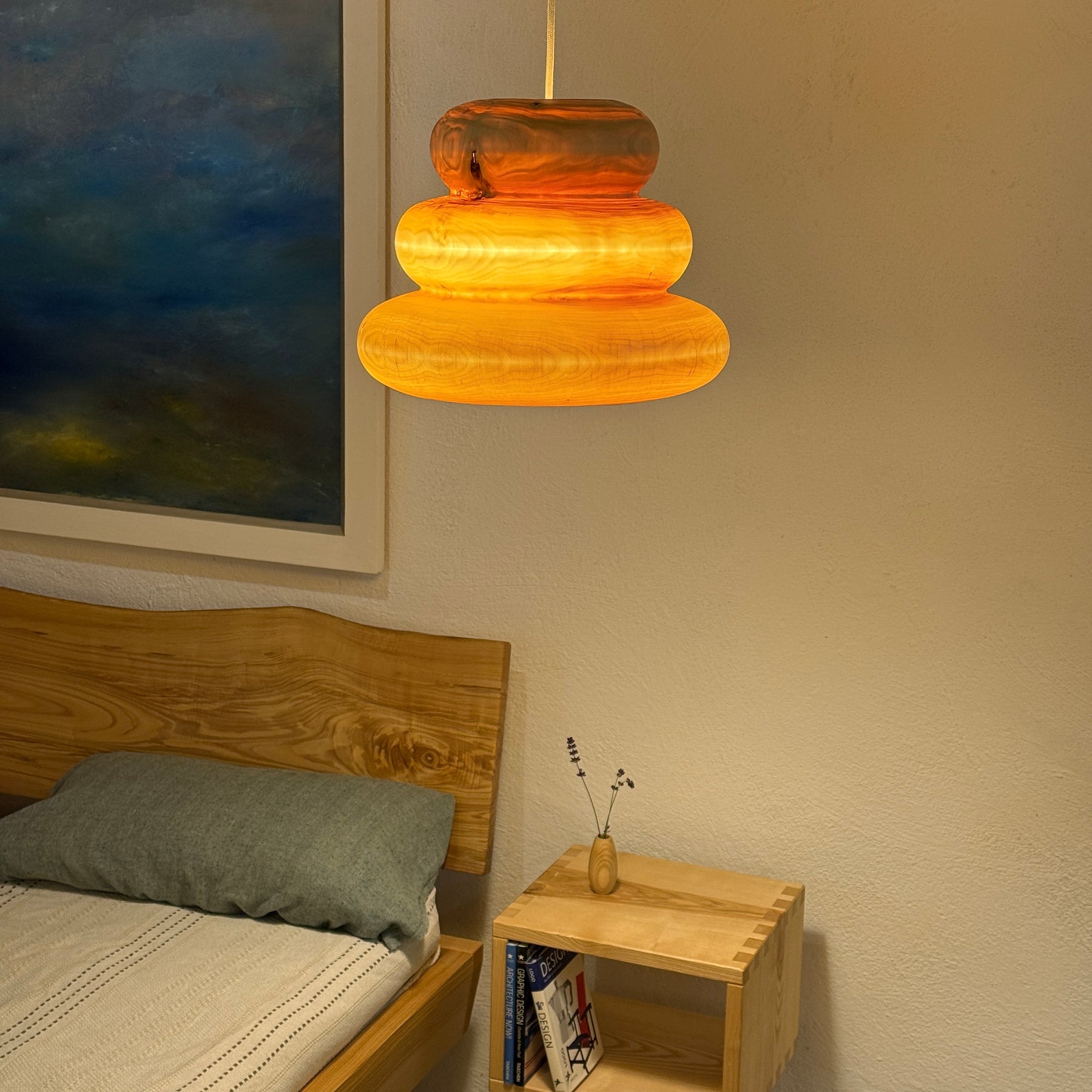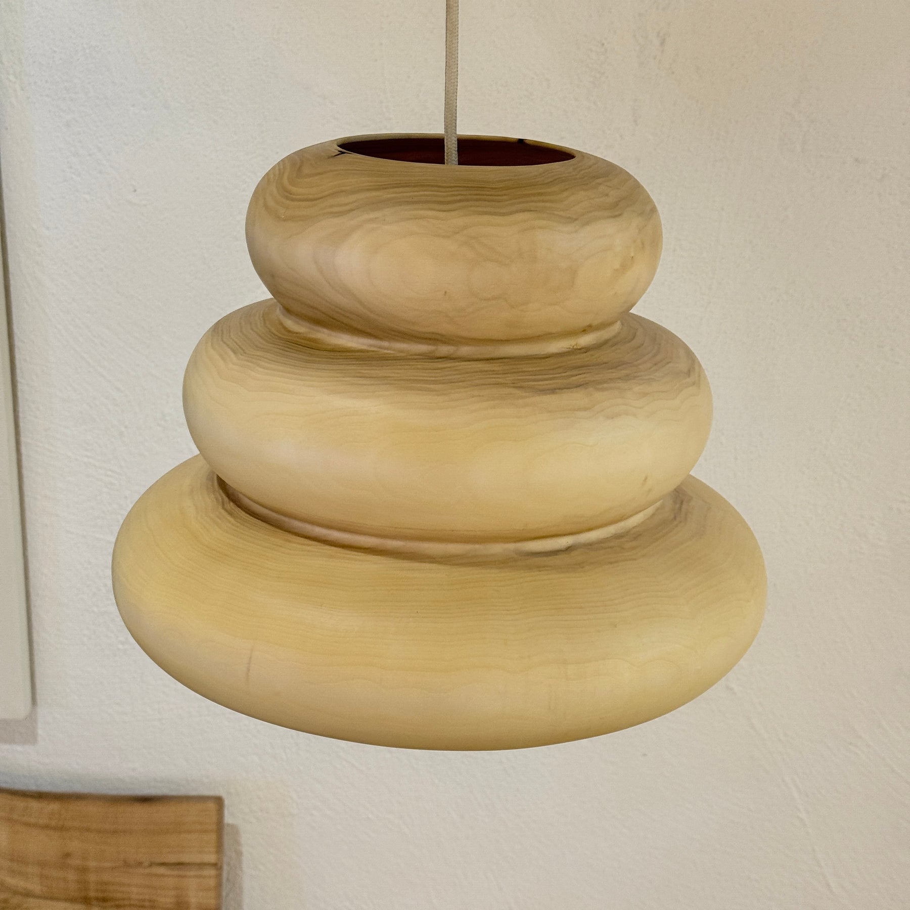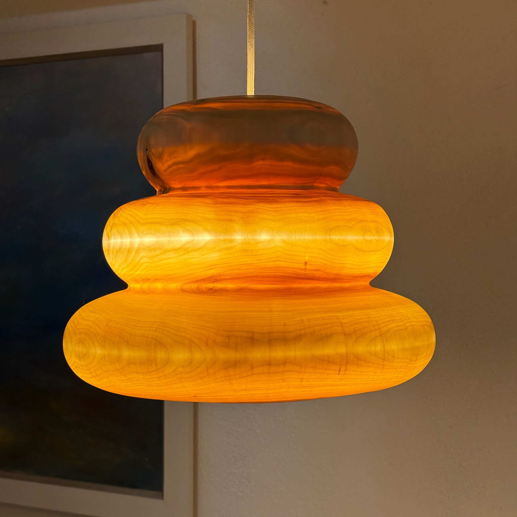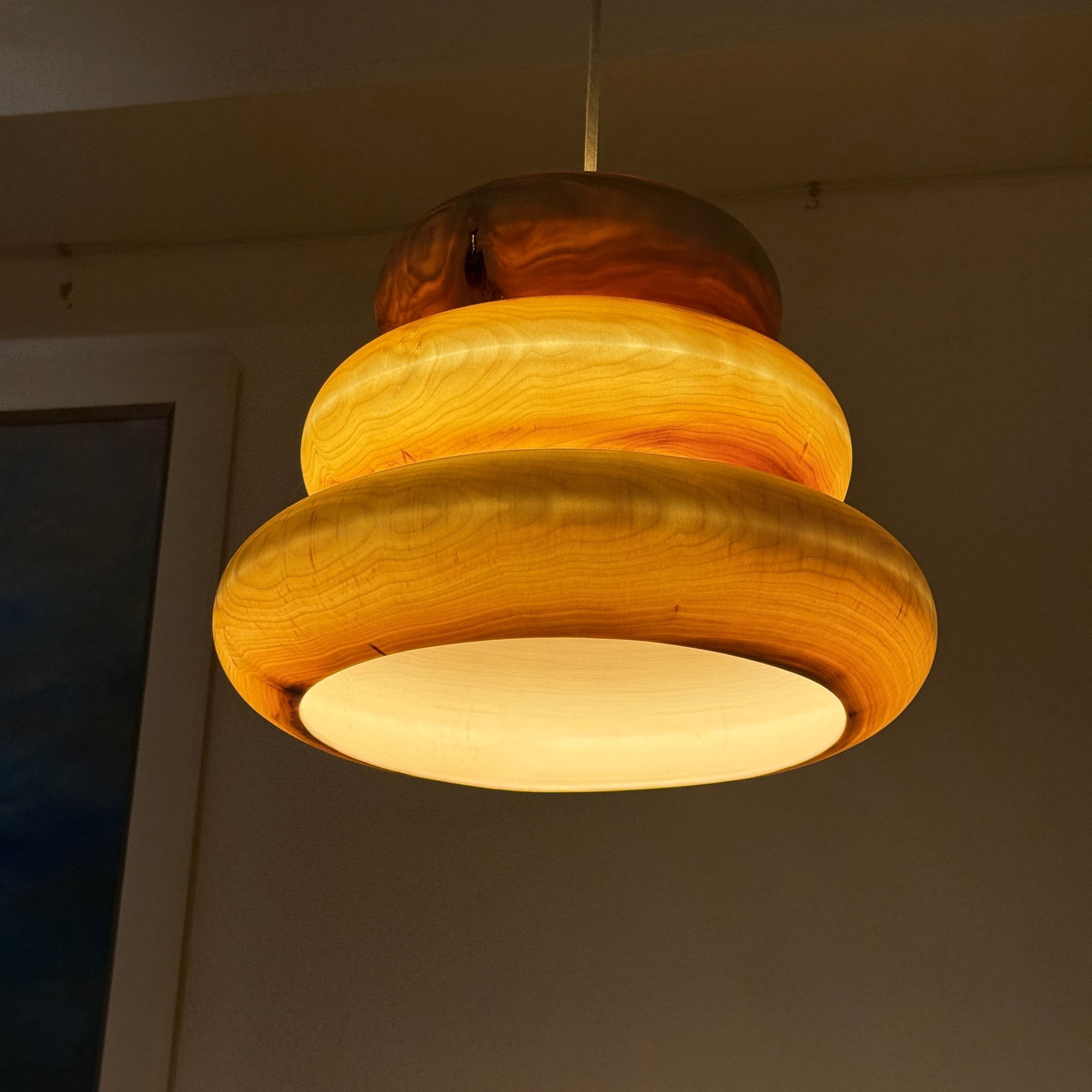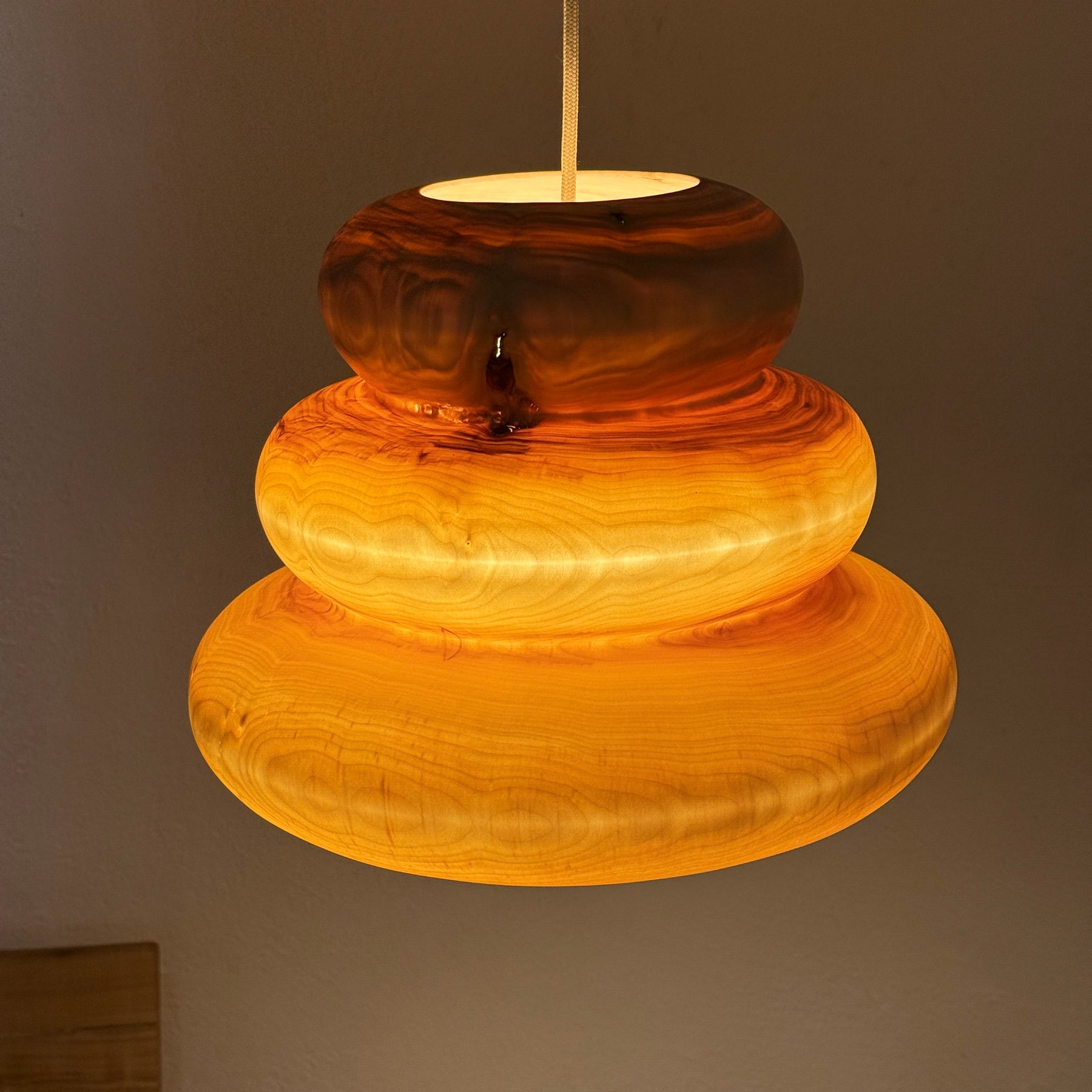 Das Holz dieser Lampe ist wunderschön durchscheinend, hauchdünn gedrechselt. Sie gibt, wie alle unsere Lampen, ein sehr warmes, angenehmes Licht in den Raum ab. Sie passt gut über einen Ess- oder Wohnzimmertisch.