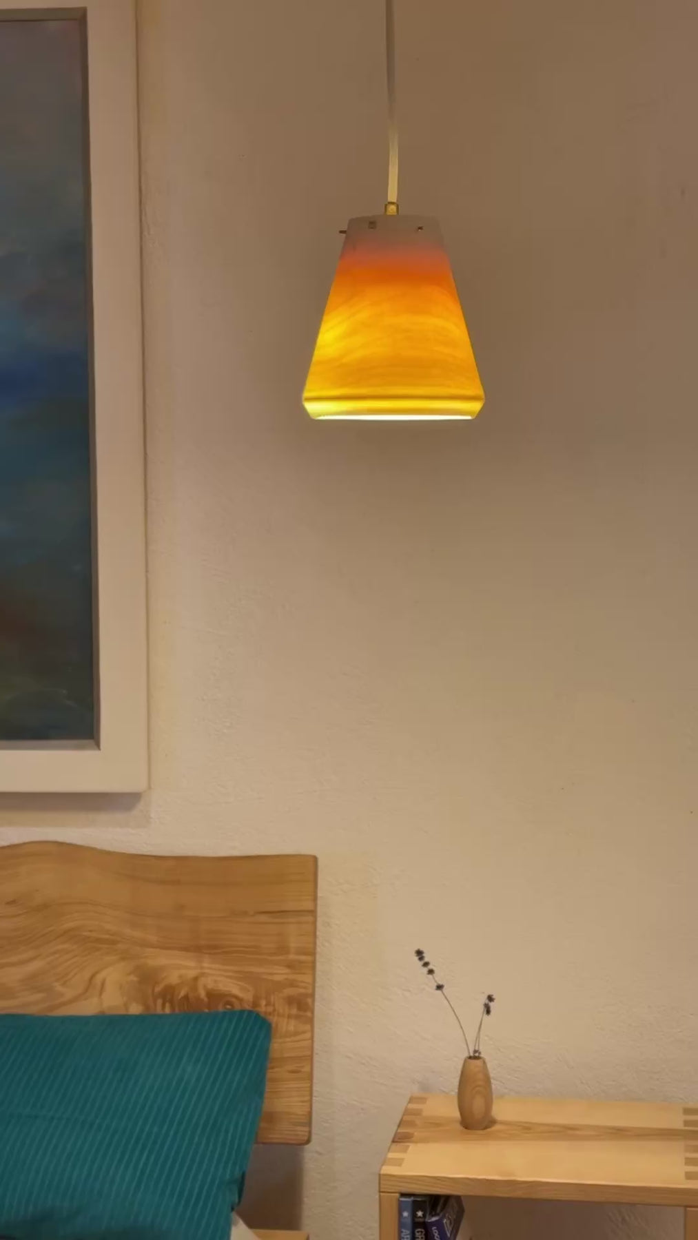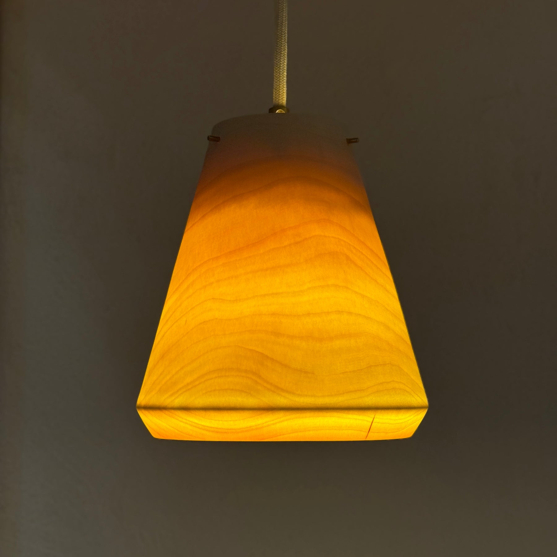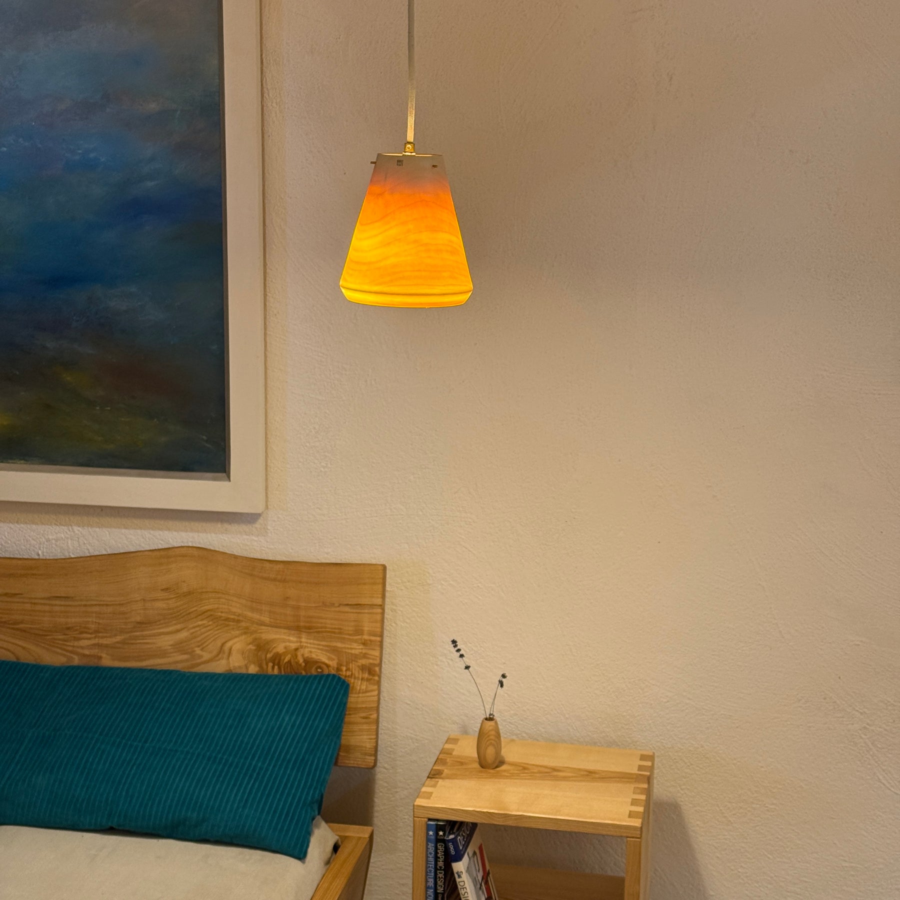 Das Holz dieser Lampen ist wunderschön durchscheinend, hauchdünn gedrechselt. Sie gibt, wie alle unsere Lampen, ein sehr warmes, angenehmes Licht in den Raum ab. Sie passt gut über einen kleinen Tisch, oder auch über einen Nachttisch neben dem Bett. auch in Kobination mit Artgleichen kann diese Lampe soager auch lange Tische beleuchten. Durch ihre schmale Form kann sie relativ hoch aufgehängt werden, ohne dass man geblendet wird.