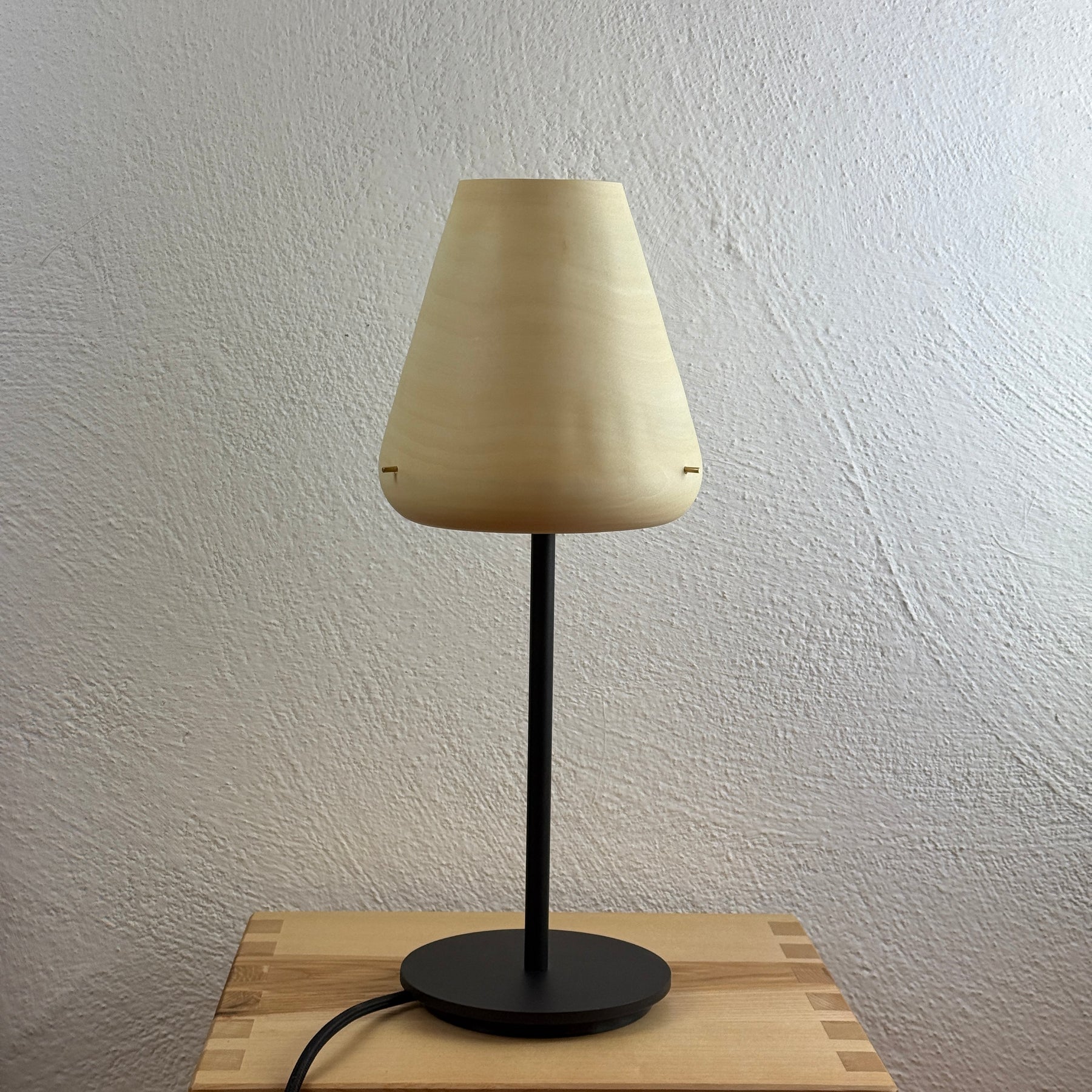 Der Schirm ist aus handgedrechseltem Pappelholz, der Stahlfuß schwarz pulverbeschichtet aus deutscher Produktion. Der Lampenschirm ist mit einer Messingaufnahme bestückt. Der Lampenfuß besitzt eine Messingfassung E14, die über einen Kippschalter im Textilkabel geschaltet wird. Somit eignet sich die Lampe perfekt als Nachttischbeleuchtung, Tischlampe oder Leselicht.