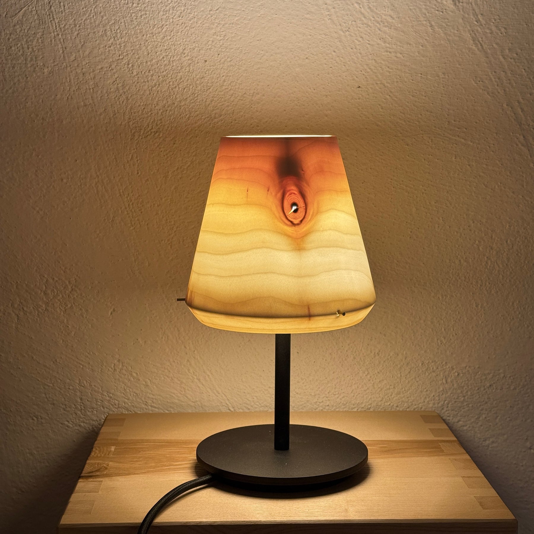 Der Schirm ist aus handgedrechseltem Pappelholz, der Stahlfuß schwarz pulverbeschichtet aus deutscher Produktion. Der Lampenschirm ist mit einer Messingaufnahme bestückt. Der Lampenfuß besitzt eine Messingfassung E14, die über einen Kippschalter im Textilkabel geschaltet wird. Somit eignet sich die Lampe perfekt als Nachttischbeleuchtung, Tischlampe oder Leselicht.