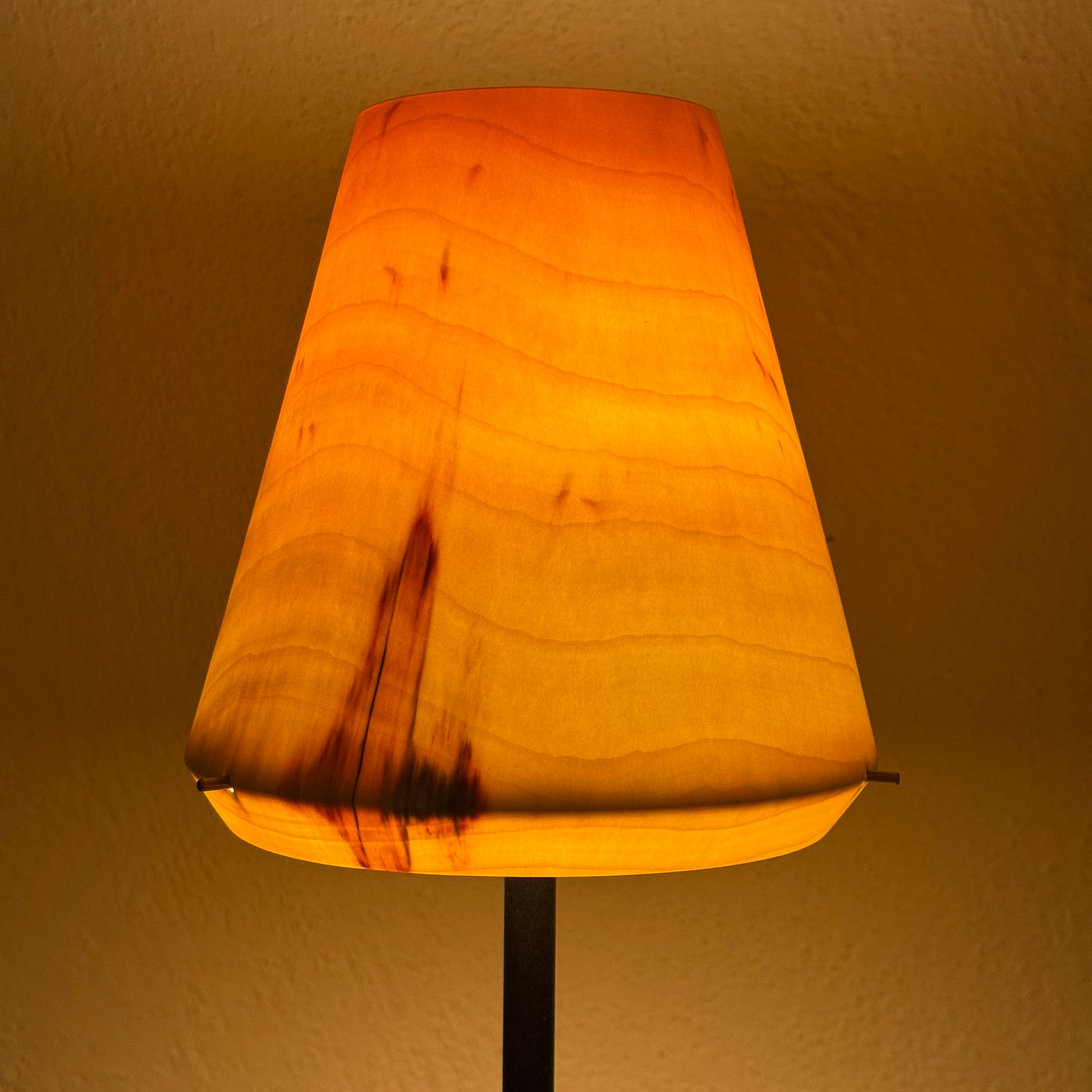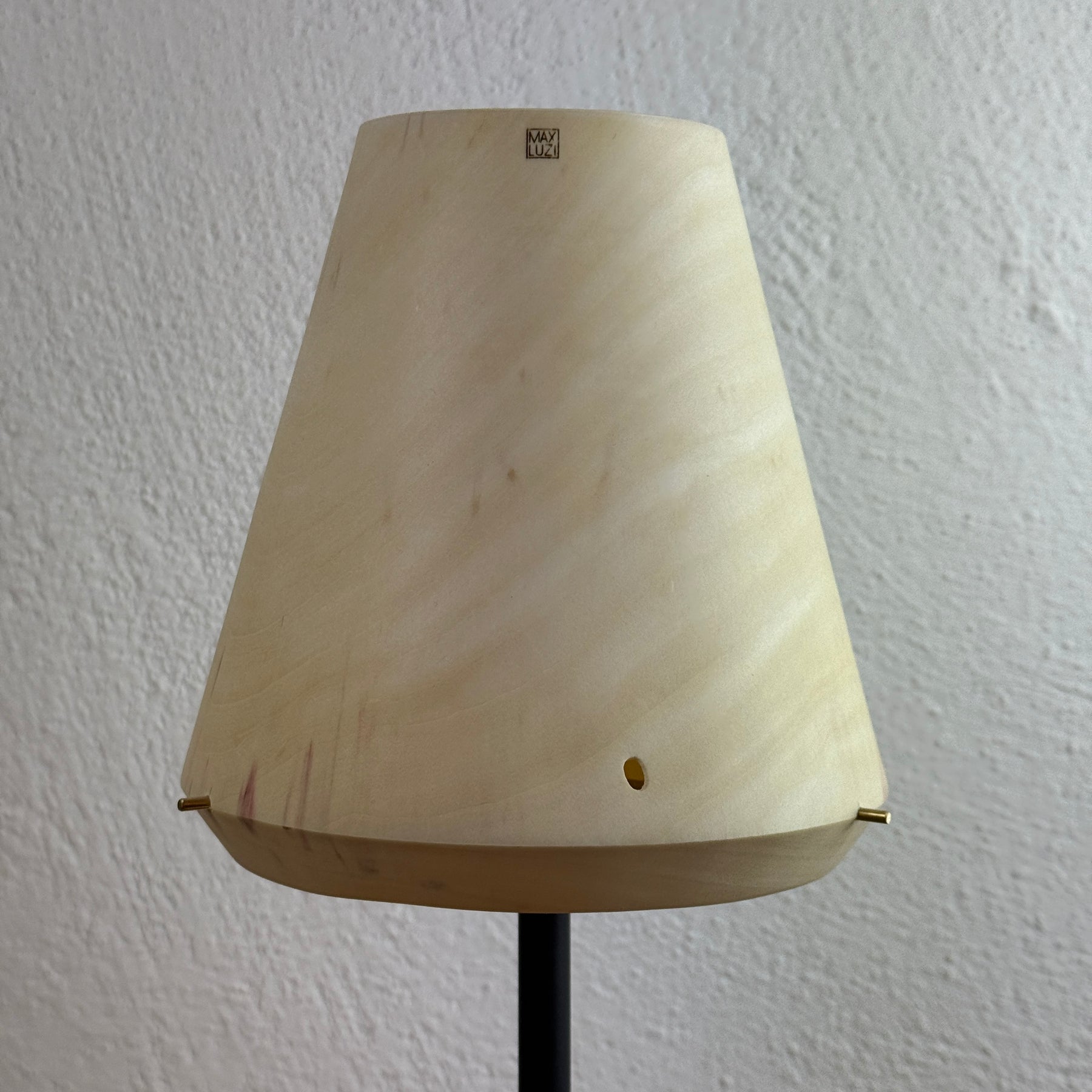 Der Schirm ist aus handgedrechseltem Pappelholz, der Stahlfuß schwarz pulverbeschichtet aus deutscher Produktion. Der Lampenschirm ist mit einer Messingaufnahme bestückt. Der Lampenfuß besitzt eine Messingfassung E14, die über einen Kippschalter im Textilkabel geschaltet wird. Somit eignet sich die Lampe perfekt als Nachttischbeleuchtung, Tischlampe oder Leselicht.