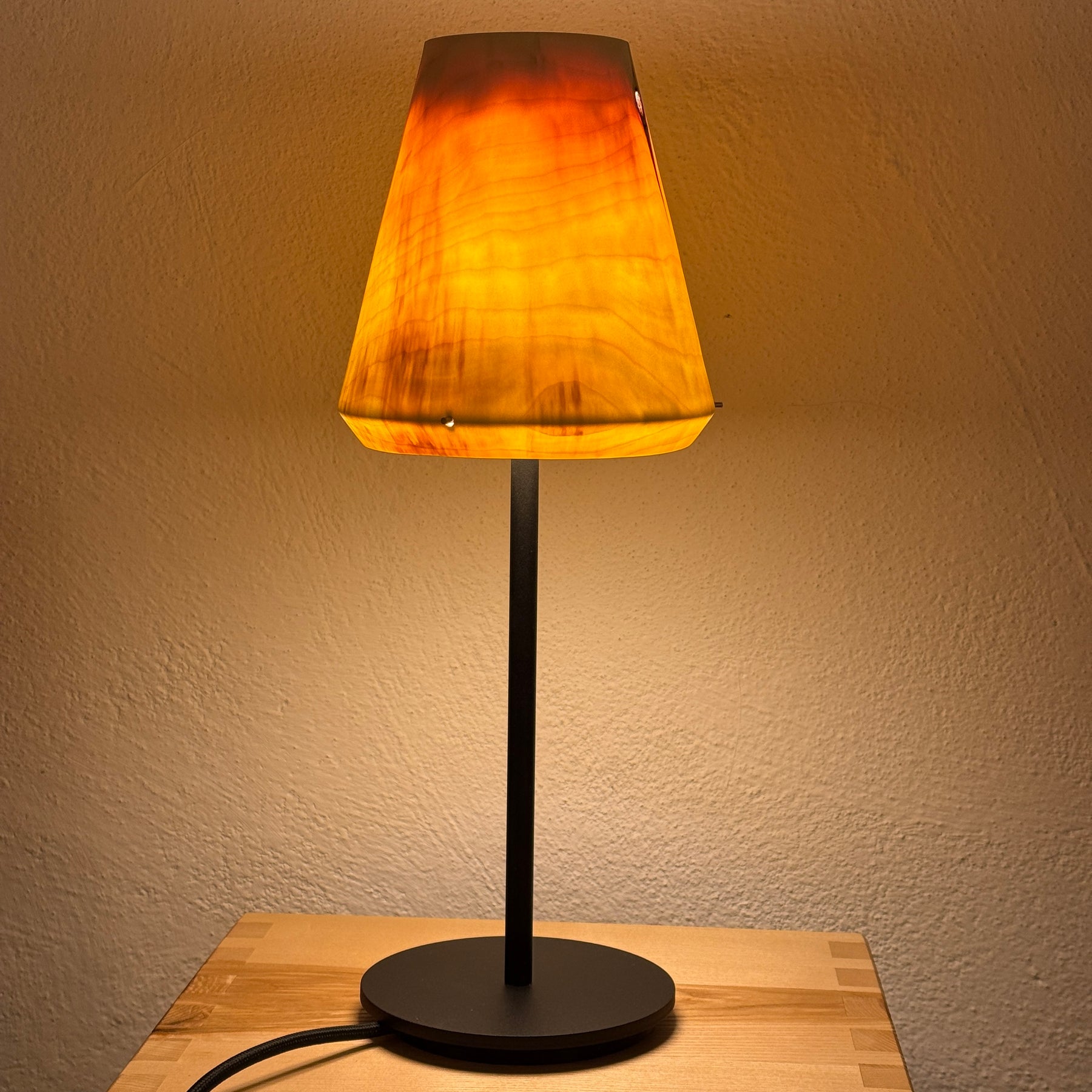 Der Schirm ist aus handgedrechseltem Pappelholz, der Stahlfuß schwarz pulverbeschichtet aus deutscher Produktion. Der Lampenschirm ist mit einer Messingaufnahme bestückt. Der Lampenfuß besitzt eine Messingfassung E14, die über einen Kippschalter im Textilkabel geschaltet wird. Somit eignet sich die Lampe perfekt als Nachttischbeleuchtung, Tischlampe oder Leselicht.