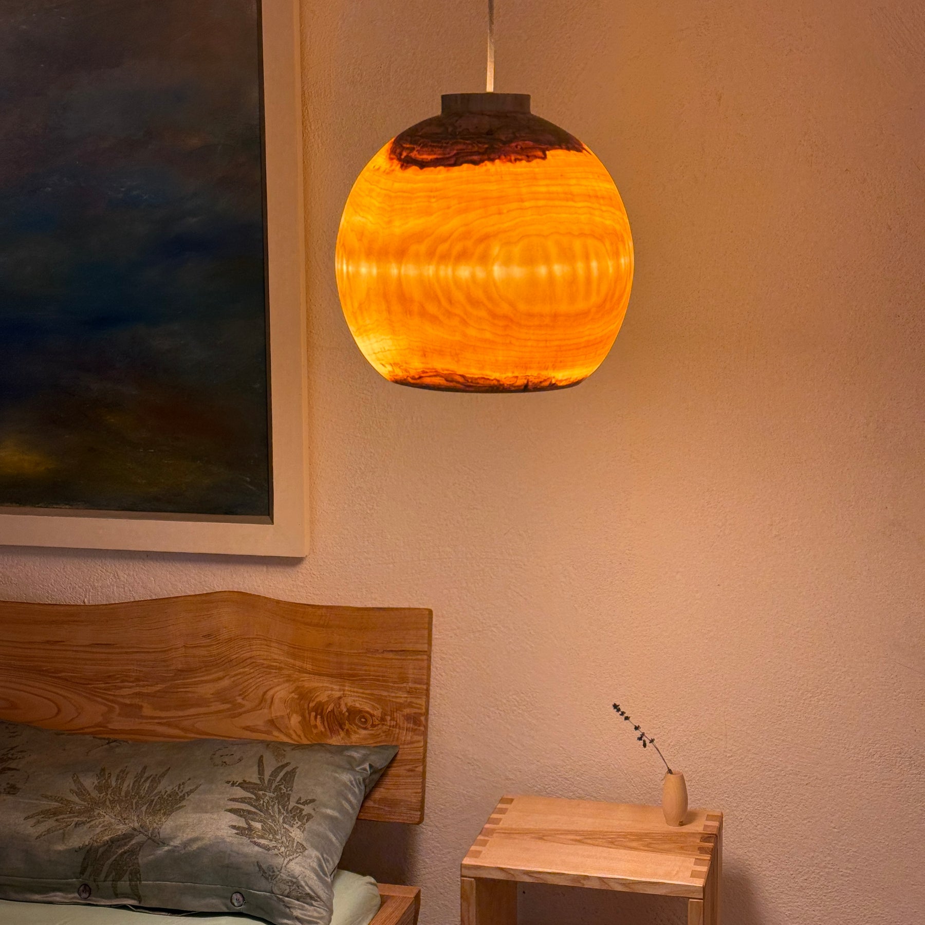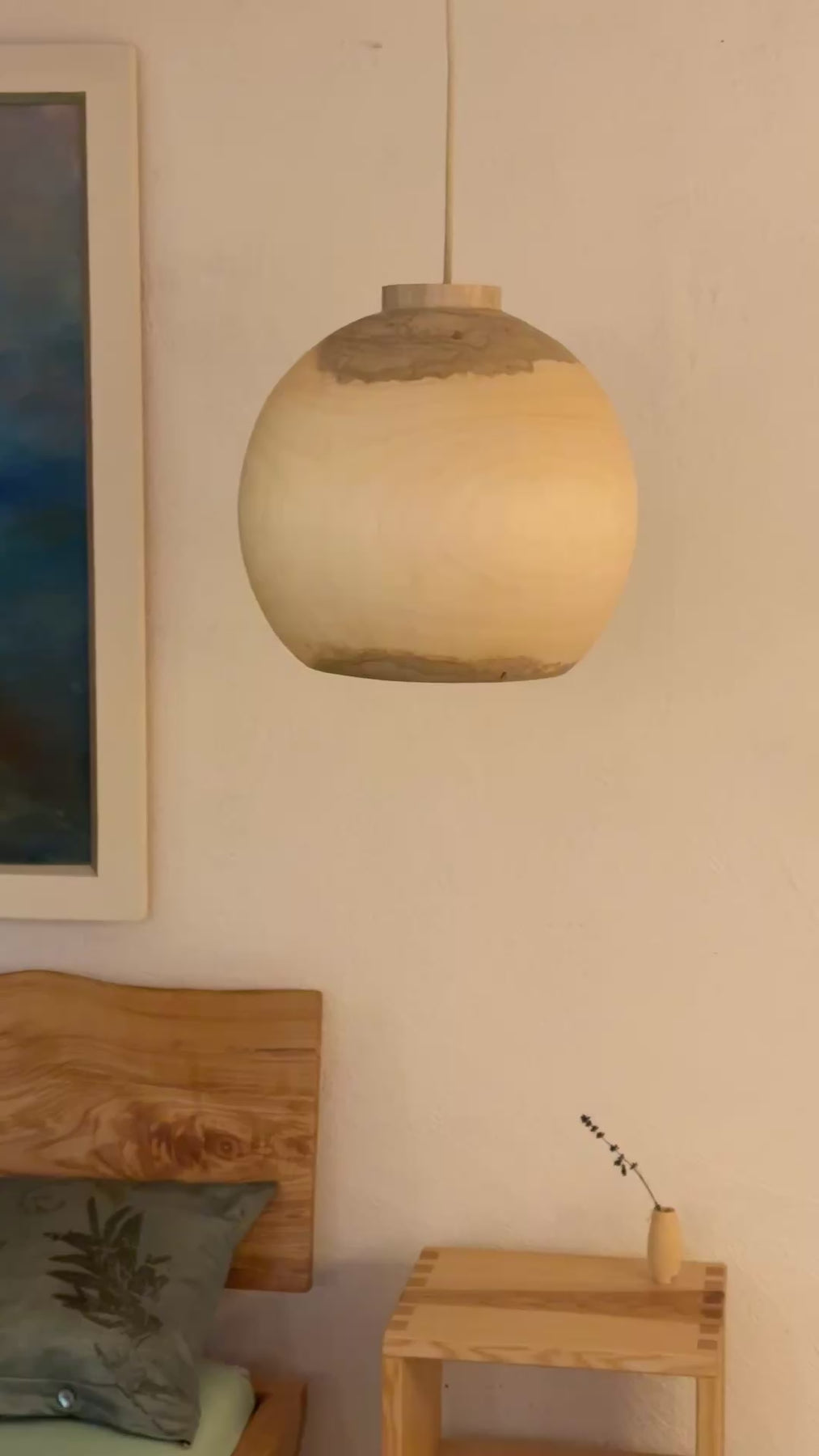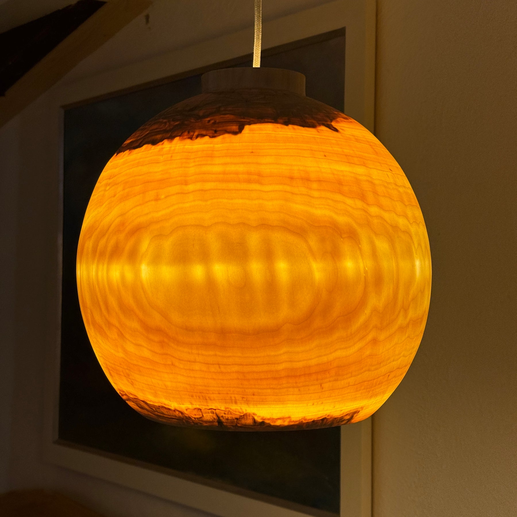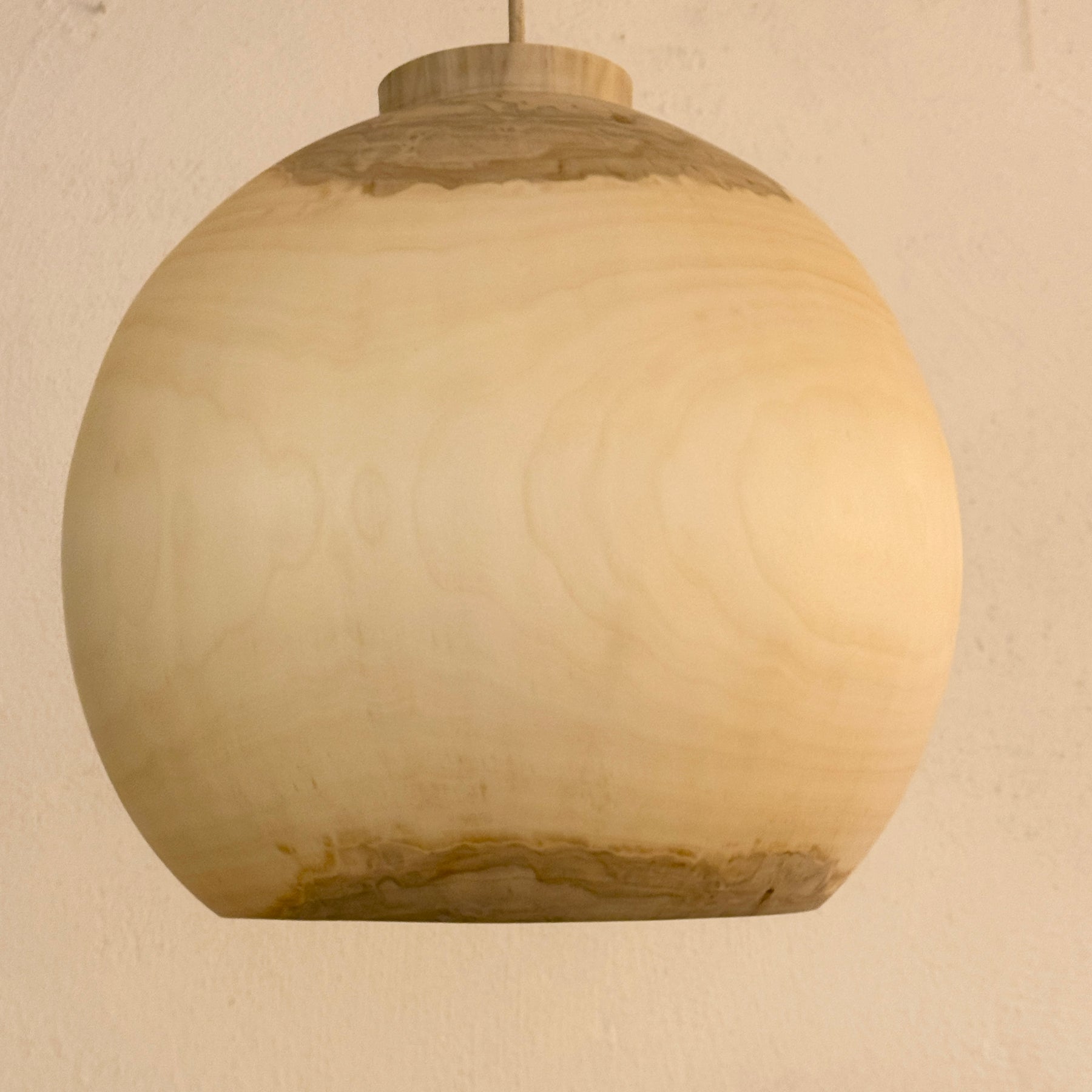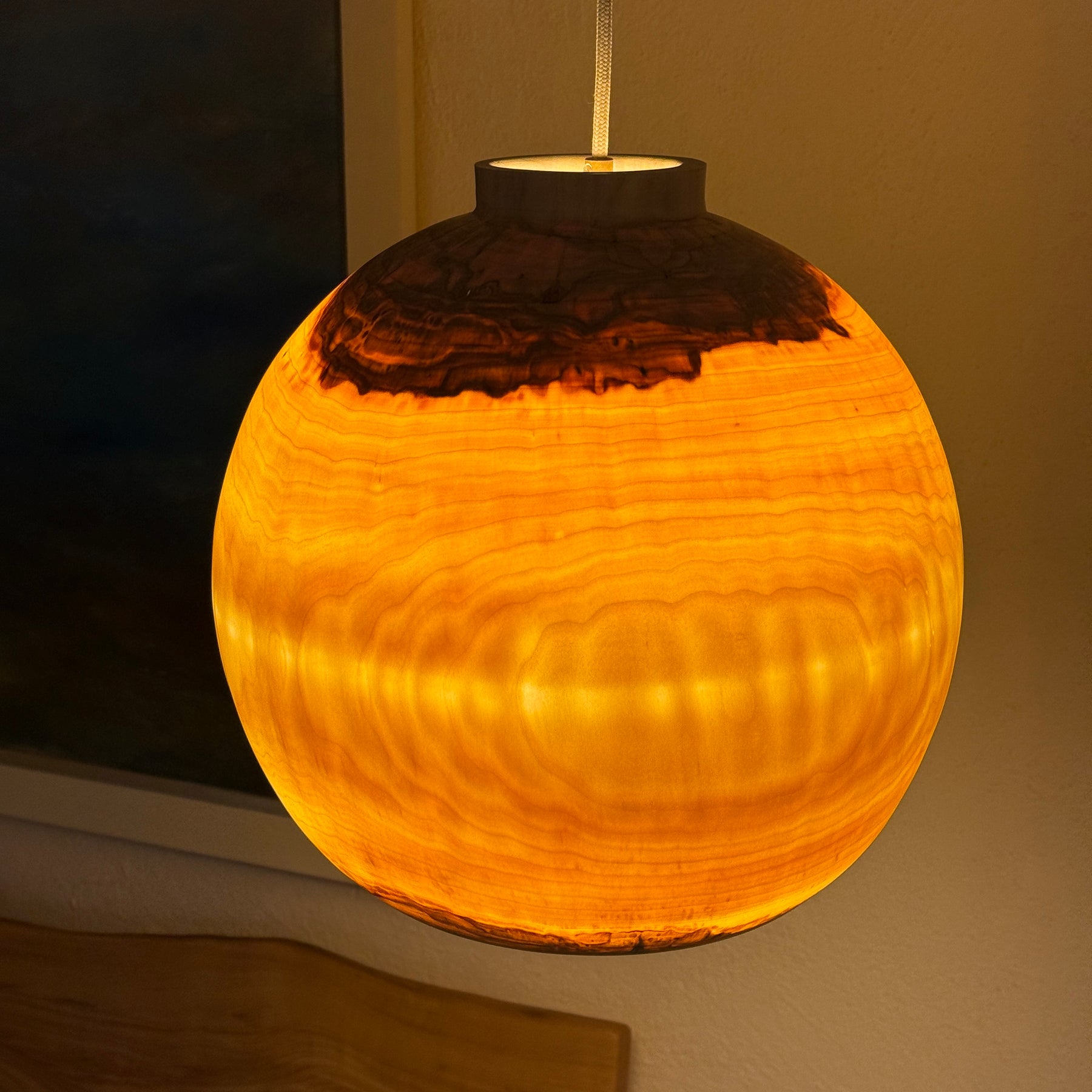 Das Holz dieser Lampe ist wunderschön durchscheinend, hauchdünn gedrechselt. Sie gibt, wie alle unsere Lampen, ein sehr warmes, angenehmes Licht in den Raum ab.
