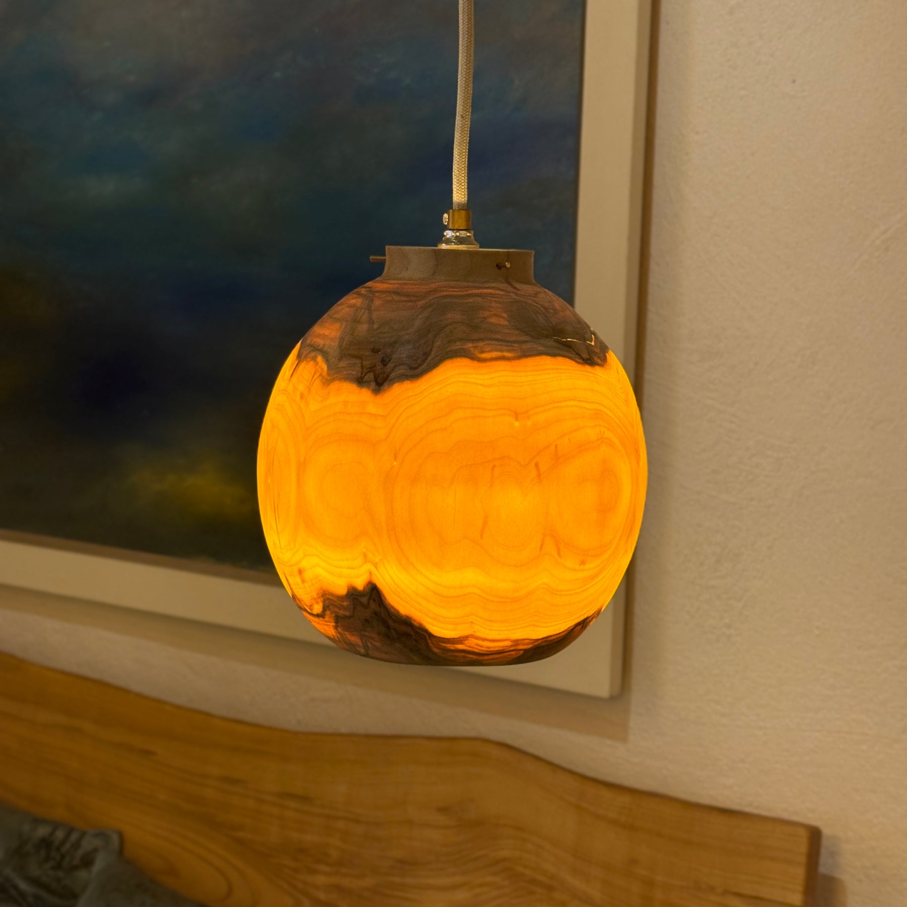 The wood of this lamp is beautifully translucent and finely turned. Like all our lamps, it emits a very warm, pleasant light into the room. It fits well above a dining or living room table. Its conical shape allows it to be hung relatively high without causing glare.