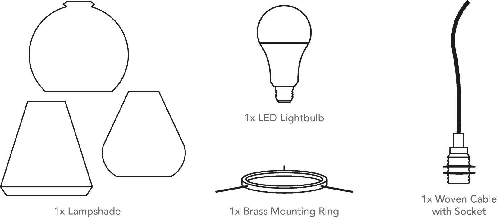 Lampenschirm, Passende LED (7W/806lm), Aufnahmering aus Messing, Messingfassung mit vor konfektioniertem Stoffkabel, 2m, elfenbeinfarben.