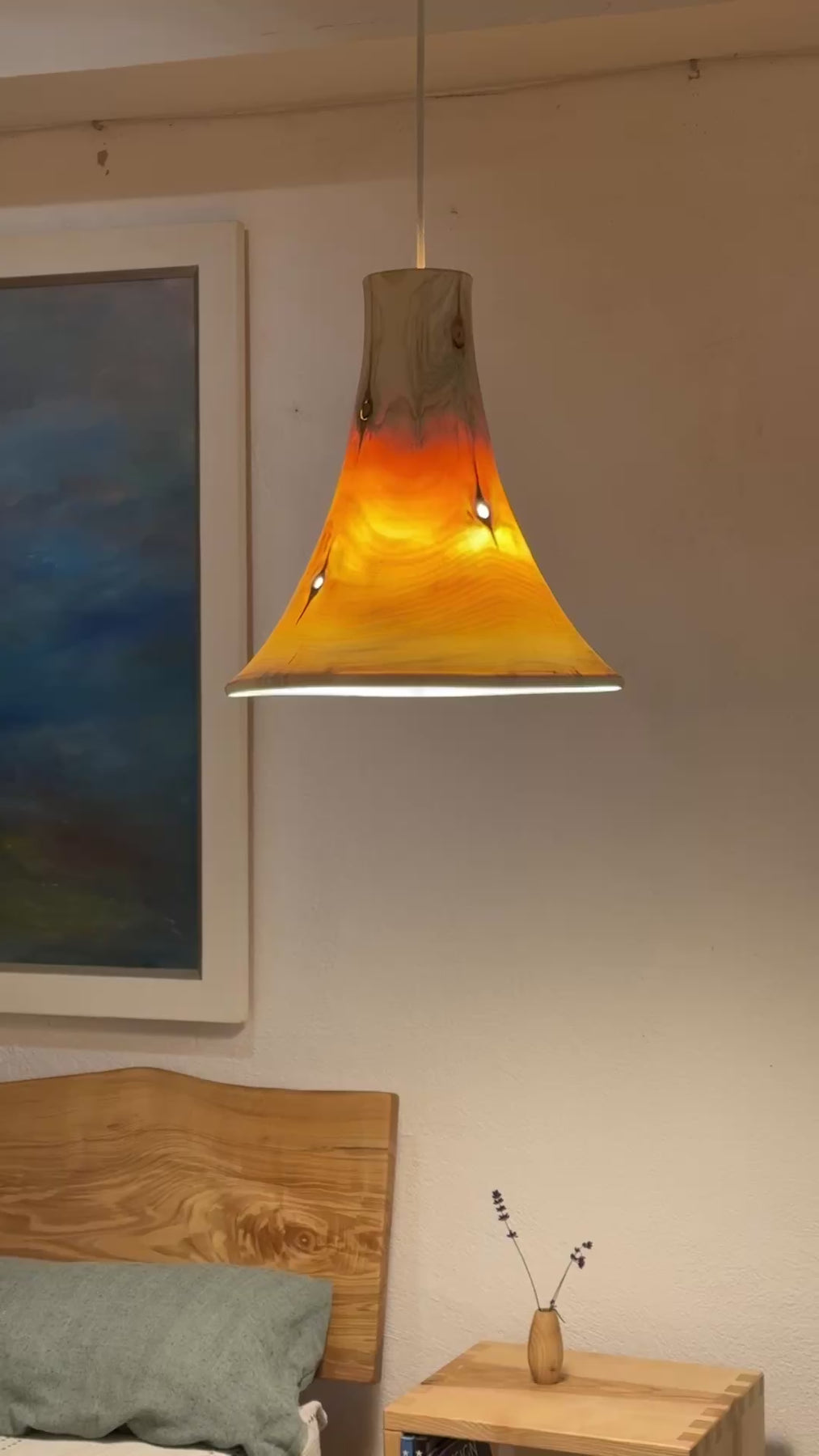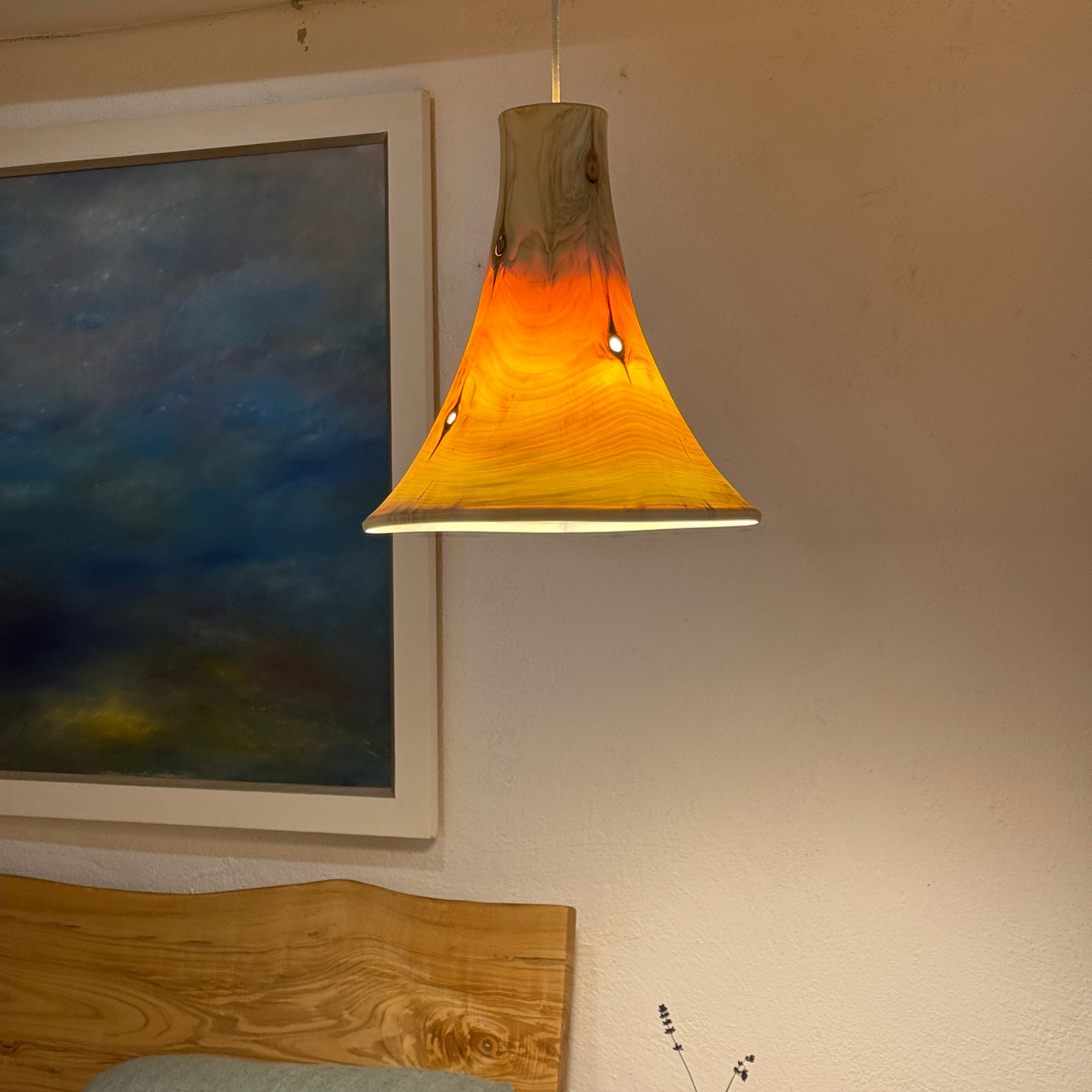 Das Holz dieser Lampe ist wunderschön durchscheinend, hauchdünn gedrechselt. Sie gibt, wie alle unsere Lampen, ein sehr warmes, angenehmes Licht in den Raum ab.