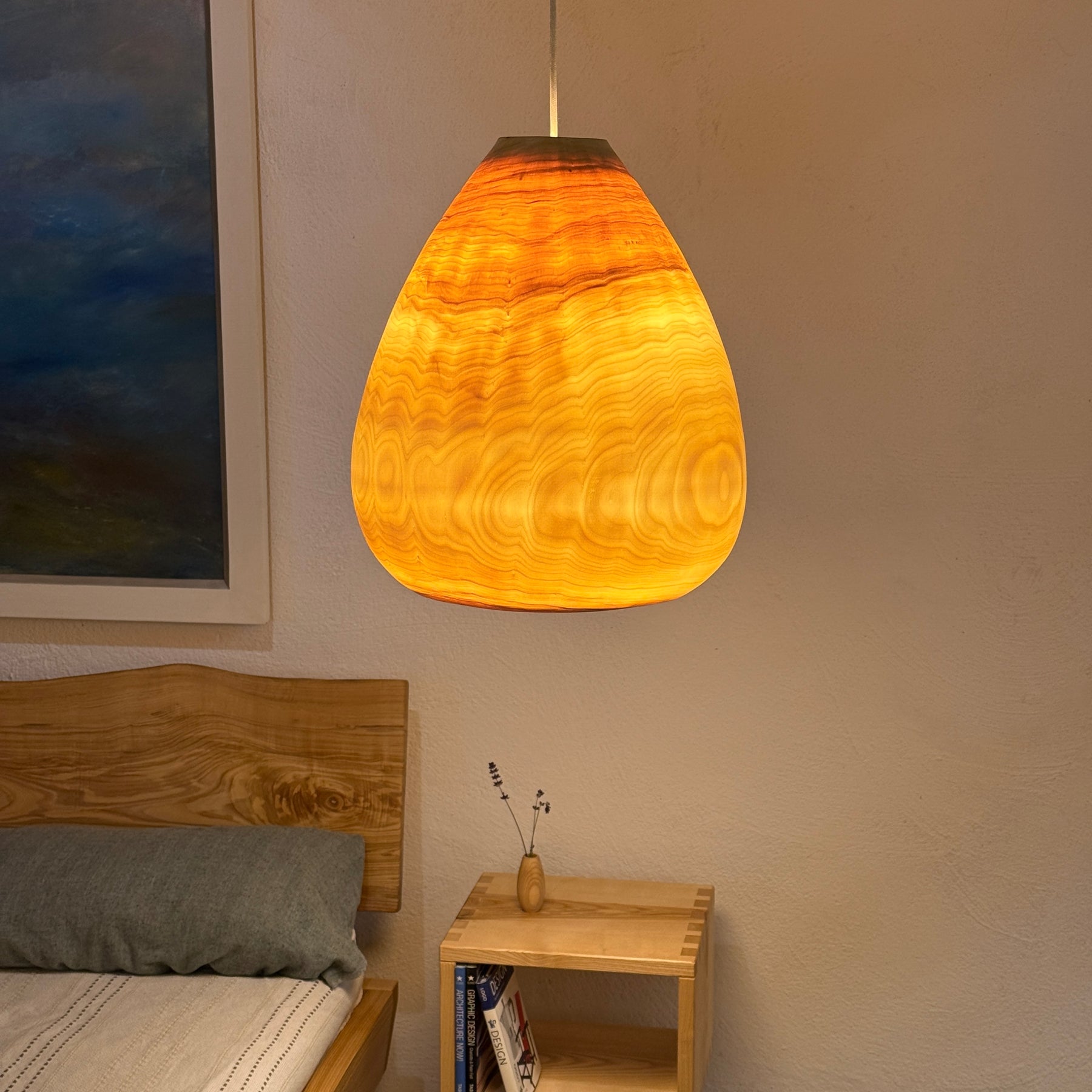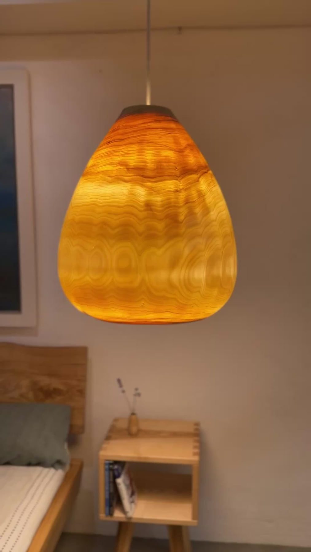 Das Holz dieser Lampe ist wunderschön durchscheinend, hauchdünn gedrechselt. Sie gibt, wie alle unsere Lampen, ein sehr warmes, angenehmes Licht in den Raum ab.