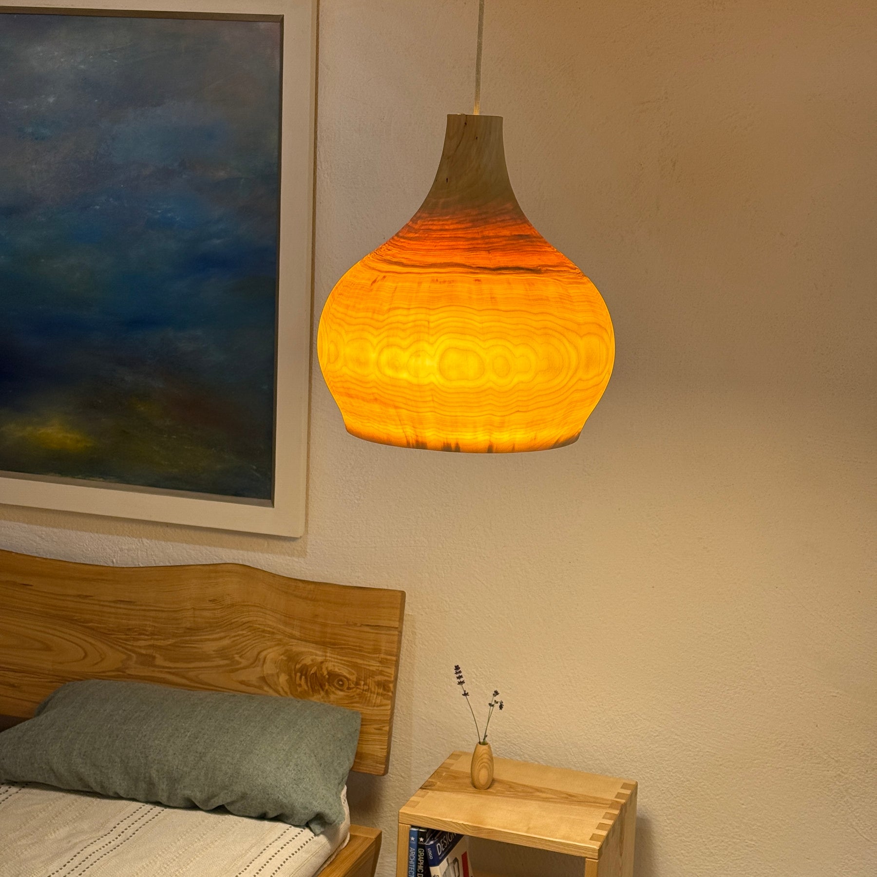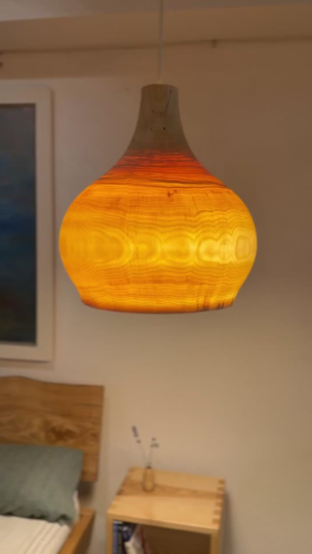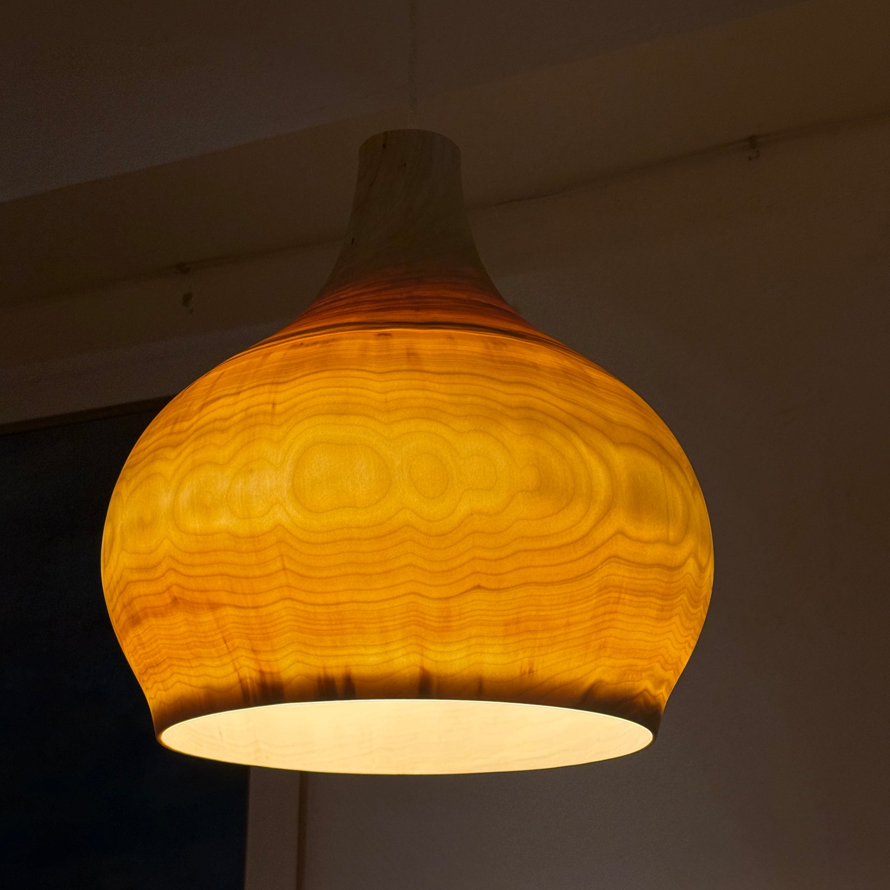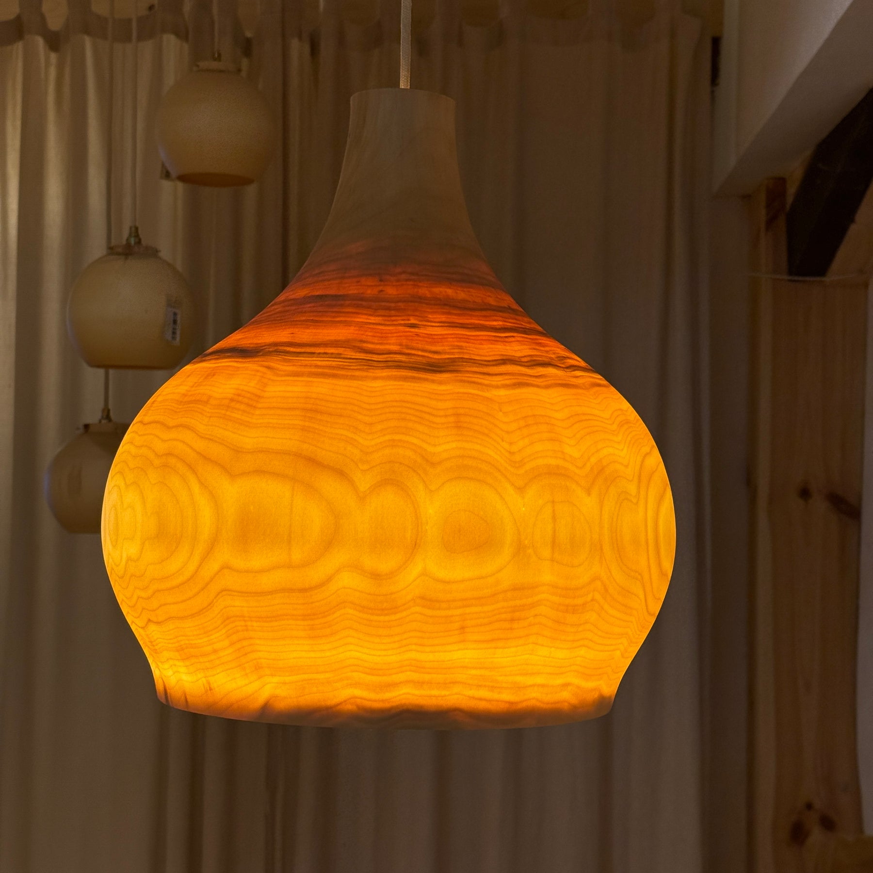 Das Holz dieser Lampe ist wunderschön durchscheinend, hauchdünn gedrechselt. Sie gibt, wie alle unsere Lampen, ein sehr warmes, angenehmes Licht in den Raum ab. Ihre Größe ist beeindruckend und die Maserungsstruktur kommt heir besonders gut zur Geltung.